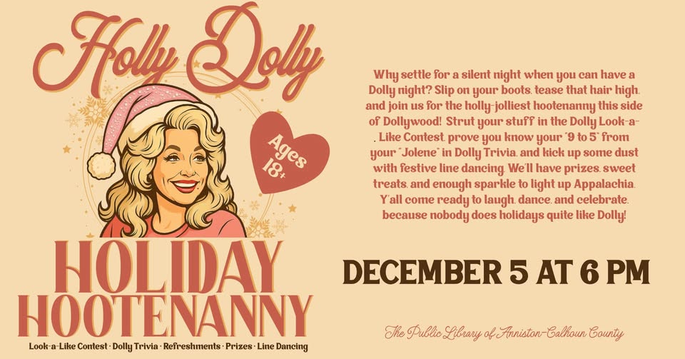 Why settle for a silent night when you can have a Dolly night? Slip on your boots, tease that hair high, and join us for the holly-jolliest hootenanny this side of Dollywood! Strut your stuff in the Dolly Look-a-Like Contest, prove you know your “9 to 5” from your “Jolene” in Dolly Trivia, and kick up some dust with festive line dancing. We’ll have prizes, sweet treats, and enough sparkle to light up Appalachia. Y’all come ready to laugh, dance, and celebrate, because nobody does holidays quite like Dolly!