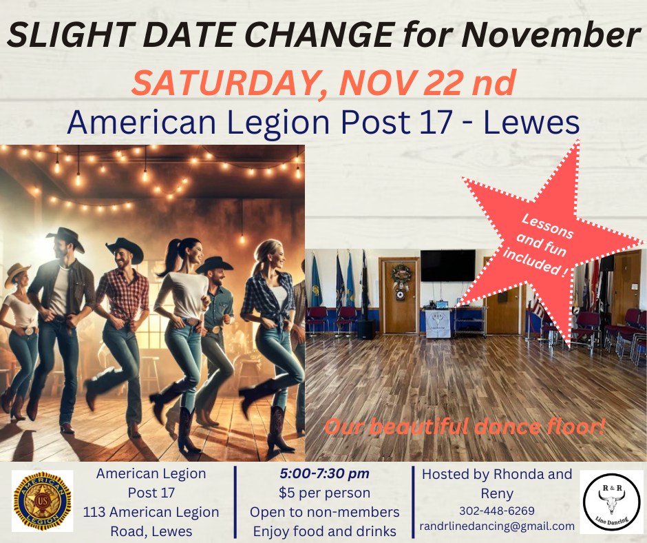 R and R Line Dancing will be dancing again at the American Legion Post 17 on November 22 nd. Slight date change for November due to another event.